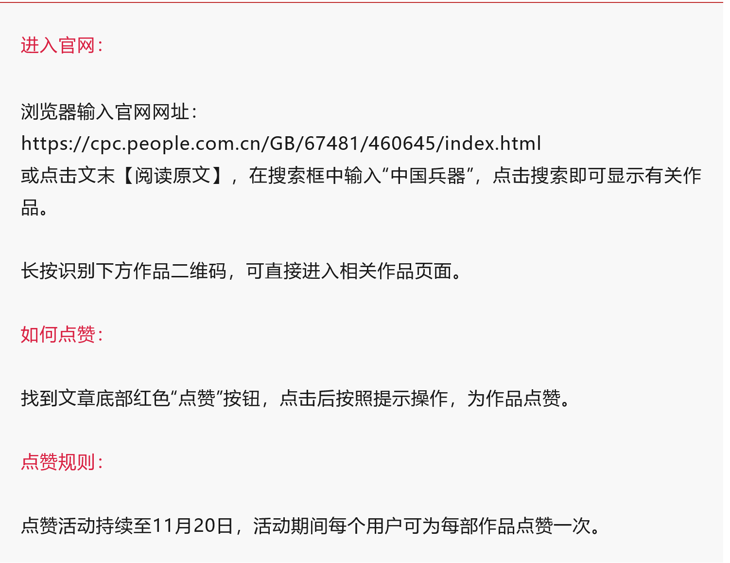 為持續(xù)提升中央企業(yè)整體形象,凝聚干事創(chuàng)業(yè)精神動力,助力“十四五”圓滿收官,推動“十五五”順利開局,今年6月,第八屆中央企業(yè)優(yōu)秀故事暨2025AIGC創(chuàng)意傳播作品征集展示活動正式啟動。本次活動以“決戰(zhàn)收官‘十四五’ 啟航奮進開新篇”為主題,圍繞“五年成就”“時代擔當”兩個維度進行征集。鼓勵廣大中央企業(yè)以“輕量化、強互動”創(chuàng)新表達形式,增強吸引力感染力,充分展現(xiàn)中央企業(yè)精神面貌。參選作品擇優(yōu)在活動官網進行集中展示,并將適時舉辦第八屆中央企業(yè)優(yōu)秀故事暨2025AIGC創(chuàng)意傳播作品發(fā)布活動,開展優(yōu)秀故事成果展、AIGC創(chuàng)意傳播成果專題展覽。 兵器工業(yè)集團共有45部作品入選,歡迎大家一起來為“兵器好故事”點贊! 點贊方法 |