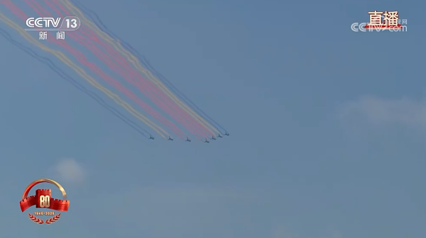 由殲10表演機(jī)發(fā)射的固體彩色發(fā)煙彈劃出14道彩煙,絢麗奪目、驚艷全場,寓意著中華民族14年可歌可泣的抗戰(zhàn)歷程,象征著14億多中國人民奔向強(qiáng)國復(fù)興的絢麗前景。該型固體彩色發(fā)煙彈拉出的紅、黃、藍(lán)三種煙帶飽和鮮亮、形態(tài)穩(wěn)定、邊界清晰,滯空時(shí)間長達(dá)數(shù)十秒不消散,同時(shí)安全環(huán)保、使用可靠、操作便捷。